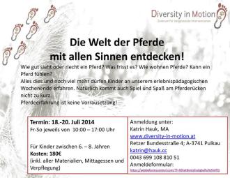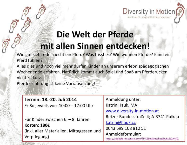 Von 18. bis 20. Juli 2014, jeweils von 10:00 - 17:00 Uhr findet unser Kinderkurs "Die Welt der Pferde mit allen Sinnen entdecken" statt.